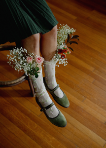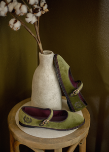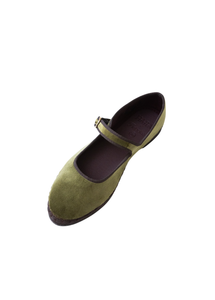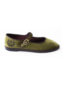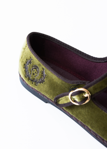 Handmade in Spain from plush olive-green velvet and finished with mocha trims and a golden buckle, this limited-edition Mary Jane carries HARA’s emblem — a symbol of divine strength and inner light.