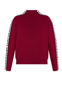 Loose knitted sweater in Tanguis cotton and baby alpaca, with a high neck and loose sleeves. Finished with ribbed trims on hem. Stripes design on sleeves with phrase GODDESS IN YOU.