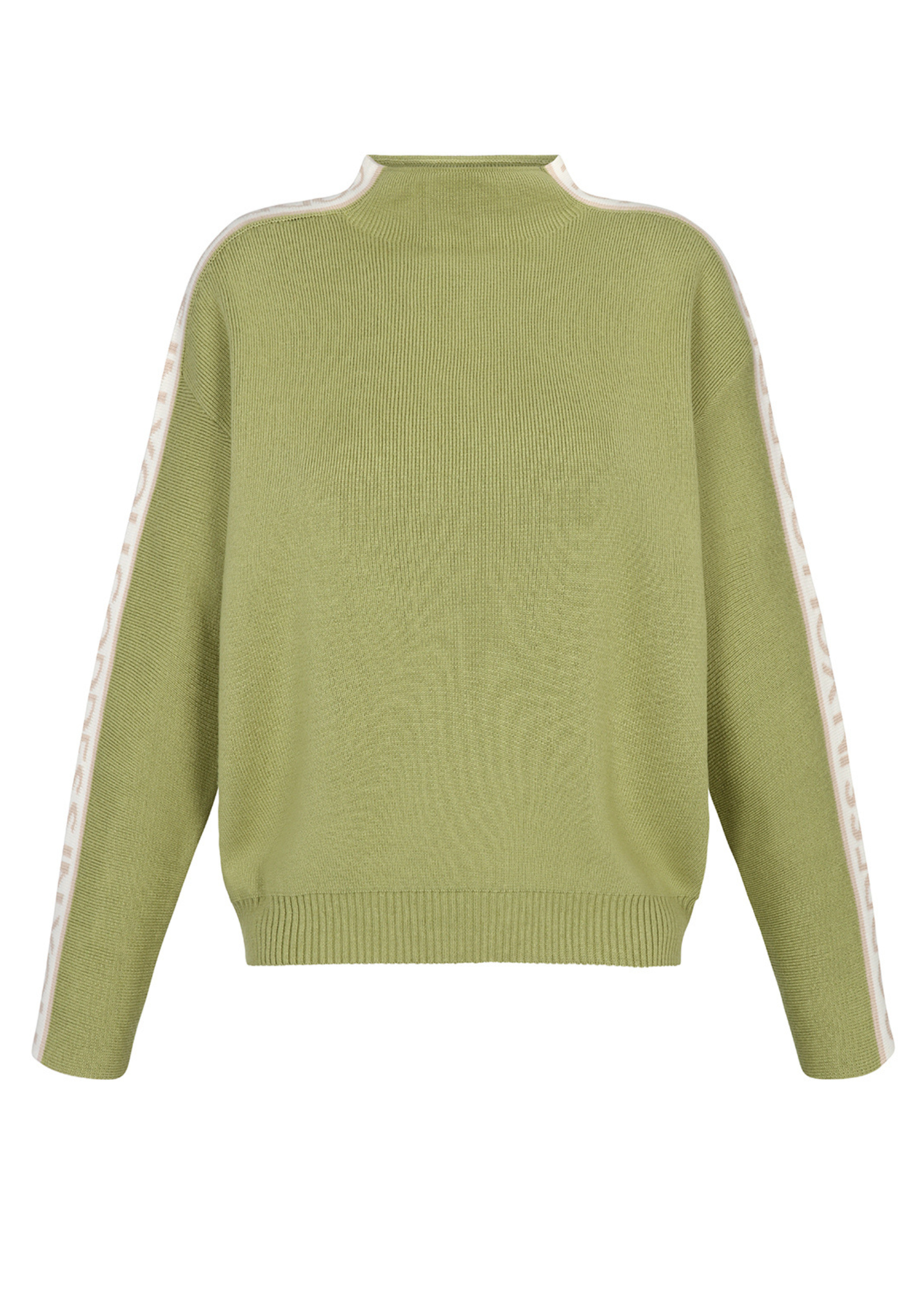 Loose knitted sweater in Tanguis cotton and baby alpaca, with a high neck and loose sleeves. Finished with ribbed trims on hem. Stripes design on sleeves with phrase GODDESS IN YOU.