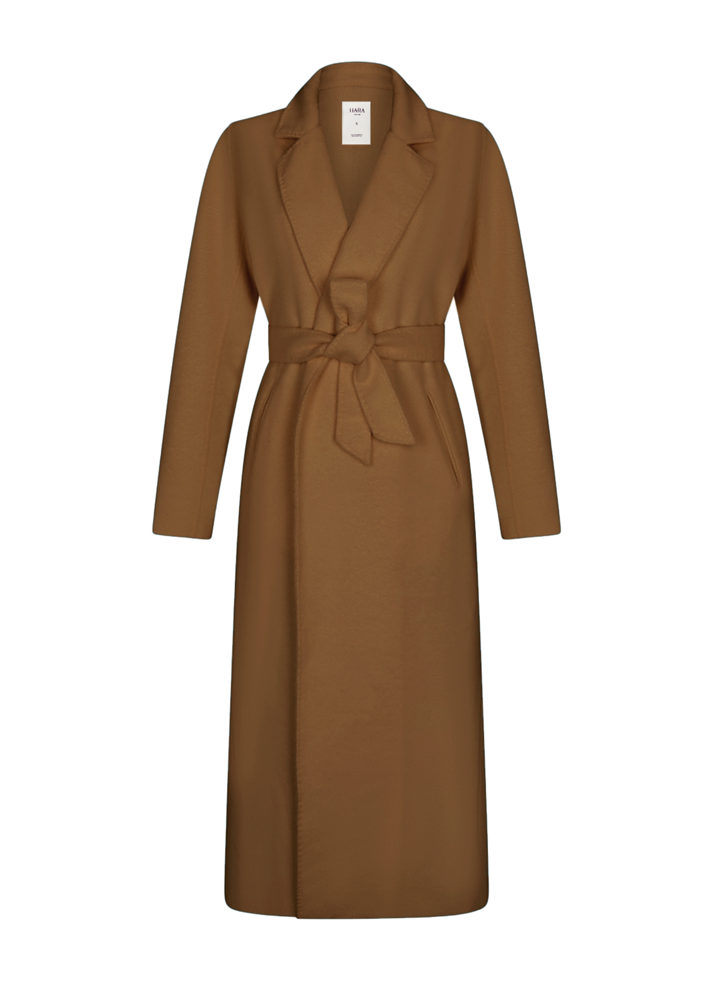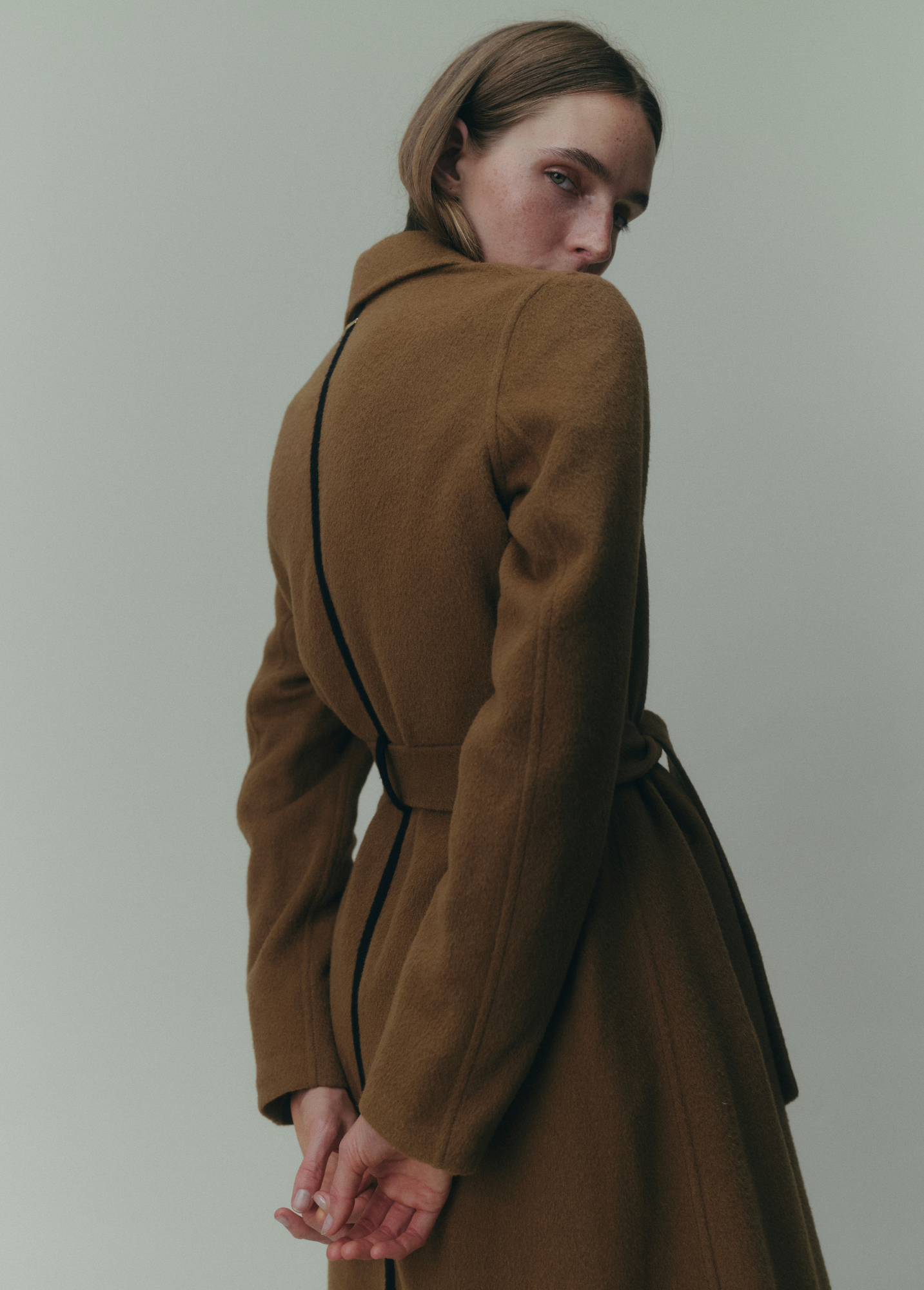 Long baby alpaca trench coat featuring a clean collar, flap and side pockets. Unlined, slightly flared and finished with a matching belt that softly defines the silhouette.