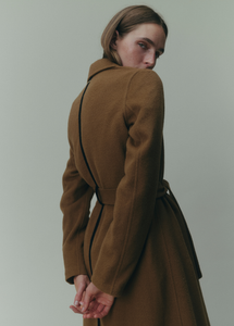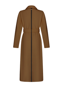 The HARA LINE TRENCH COAT stands out for its signature contrast line running from the collar down to the hem at the back — a subtle yet powerful detail that elongates the figure and embodies the concept of hara as a vertical axis of strength and balance.