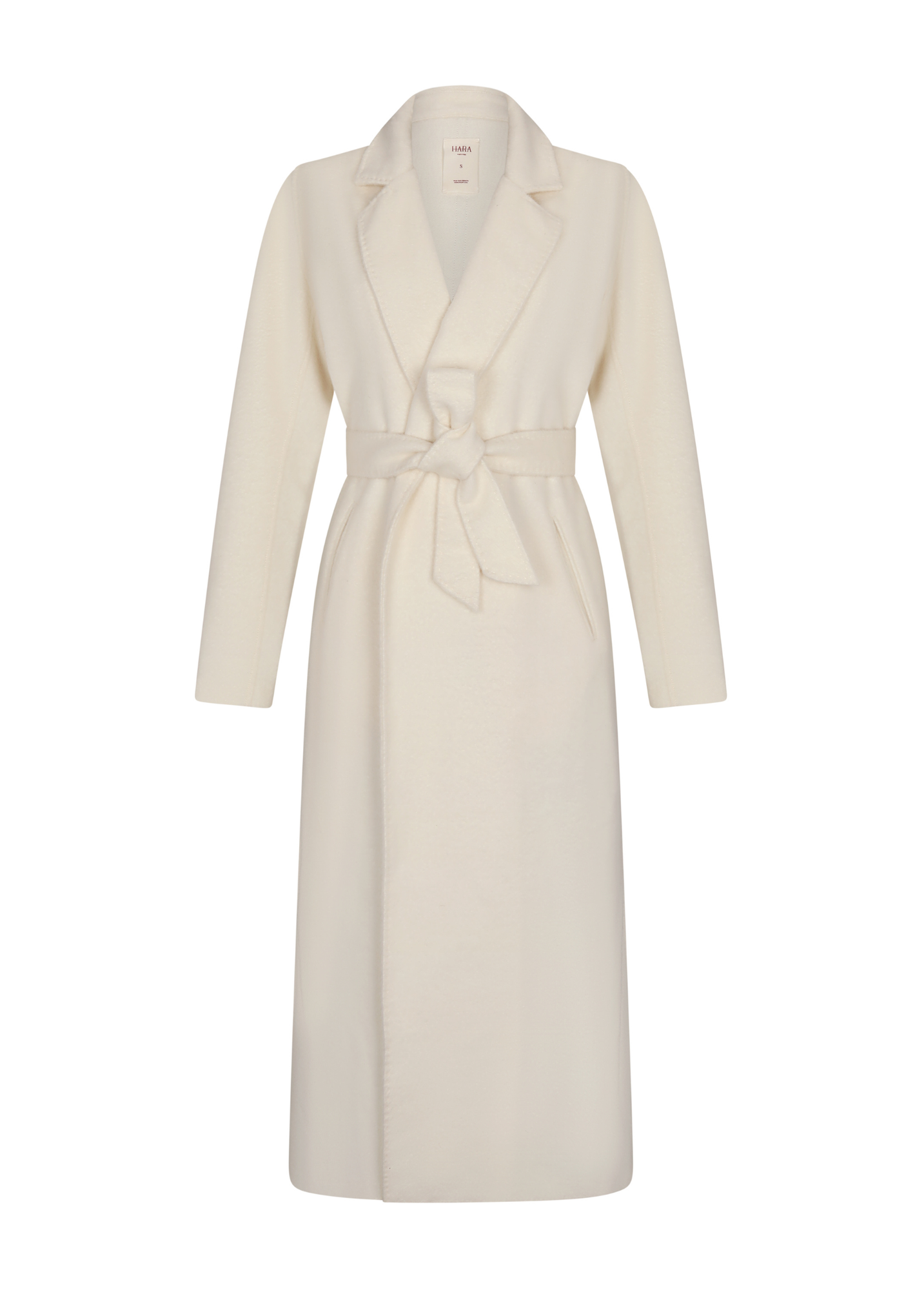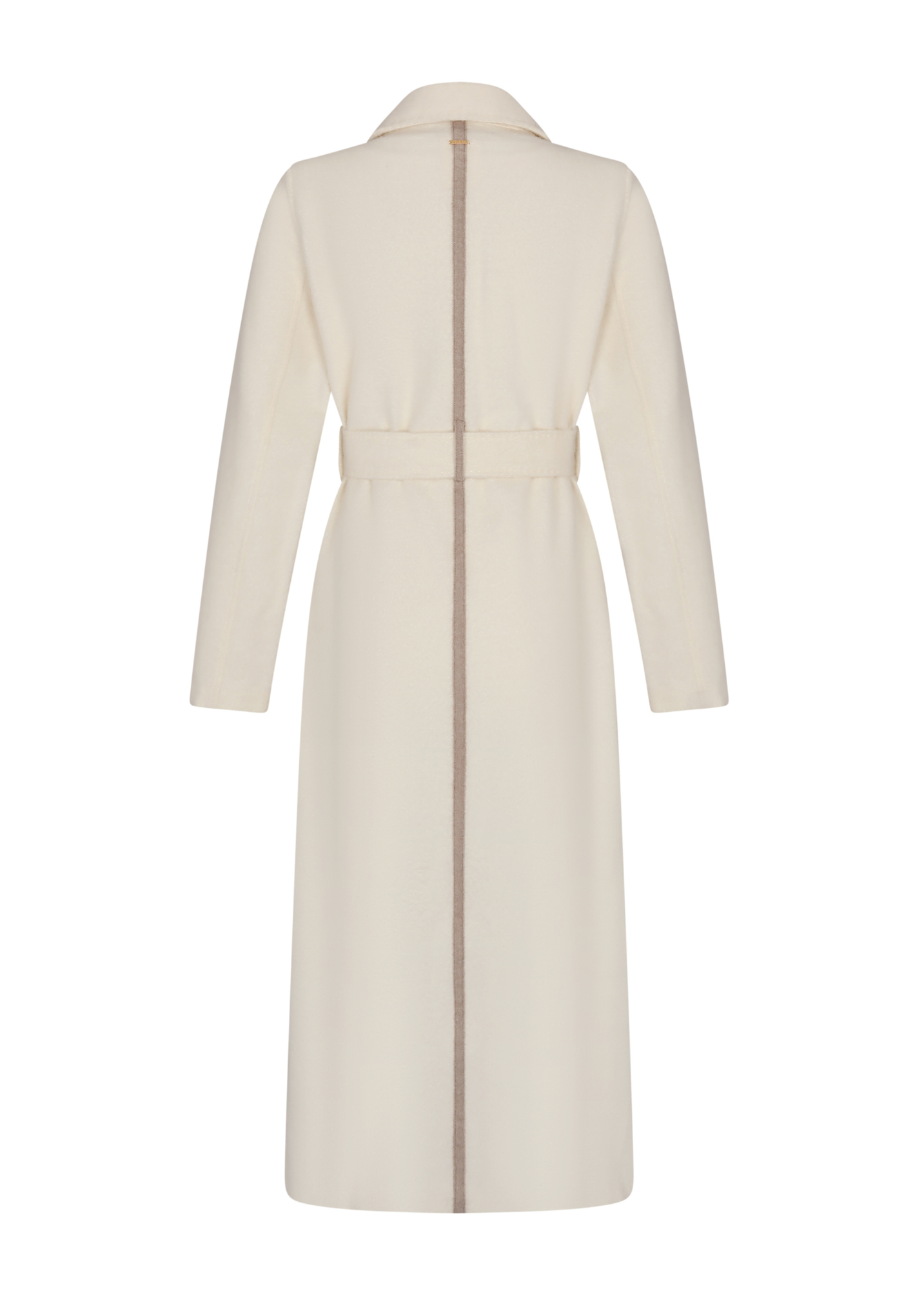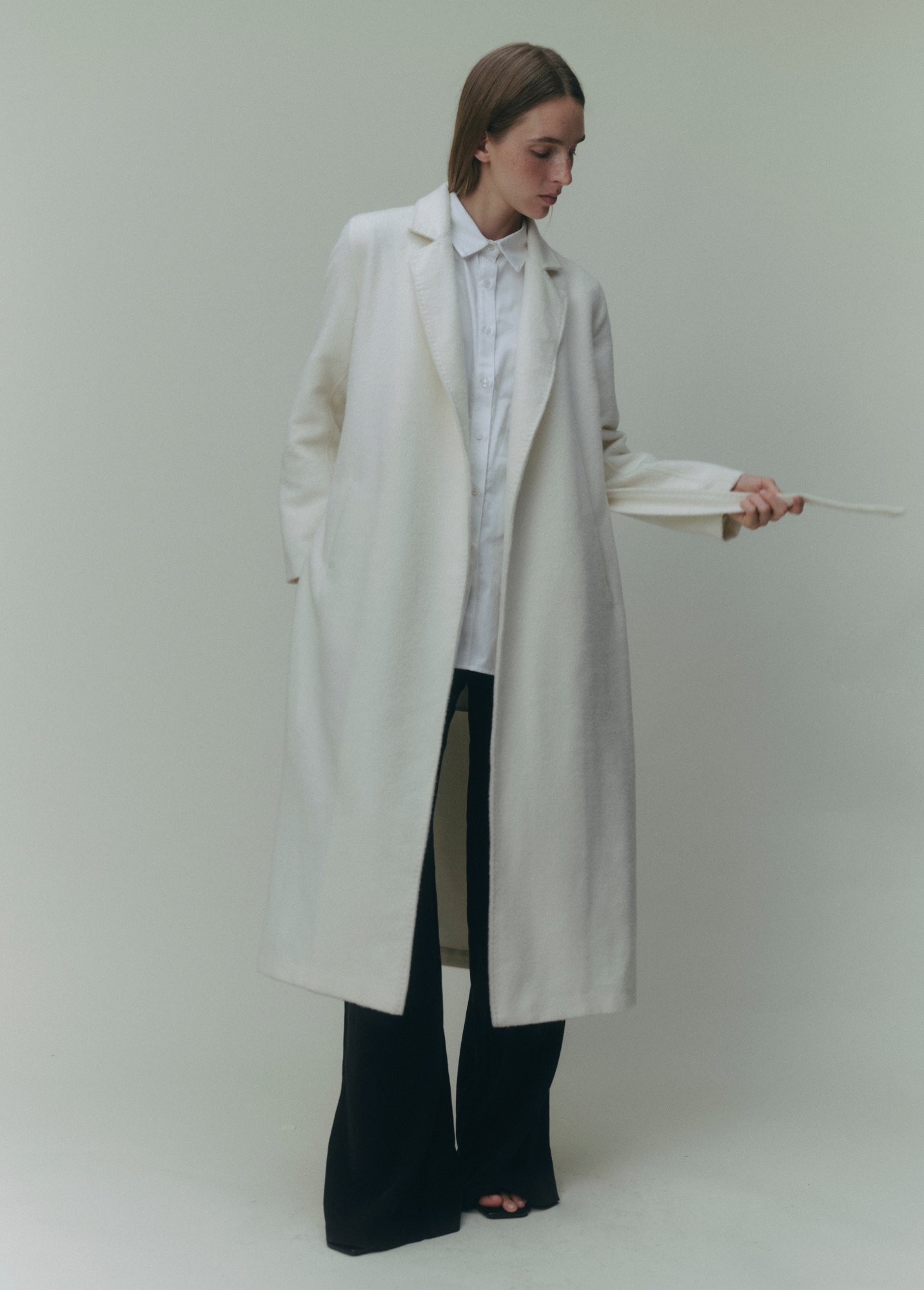 Long baby alpaca trench coat featuring a clean collar, flap and side pockets. Unlined, slightly flared and finished with a matching belt that softly defines the silhouette.