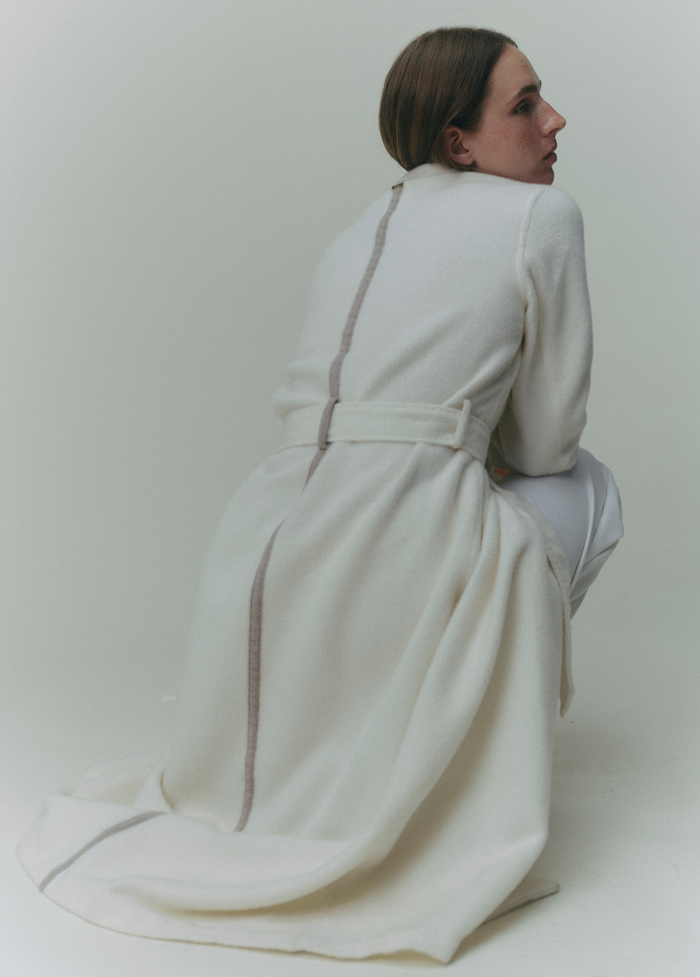 The HARA LINE TRENCH COAT stands out for its signature contrast line running from the collar down to the hem at the back — a subtle yet powerful detail that elongates the figure and embodies the concept of hara as a vertical axis of strength and balance.